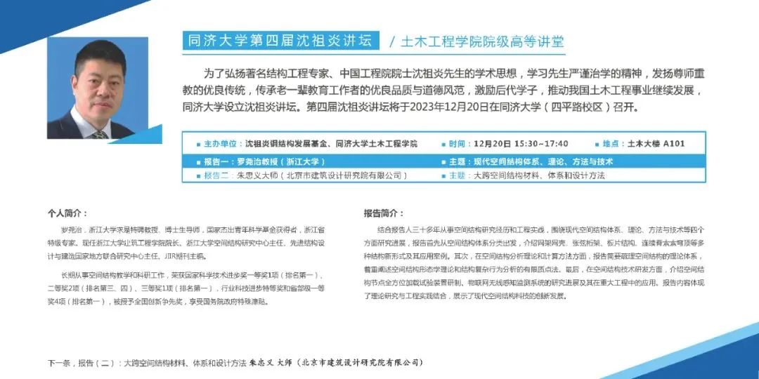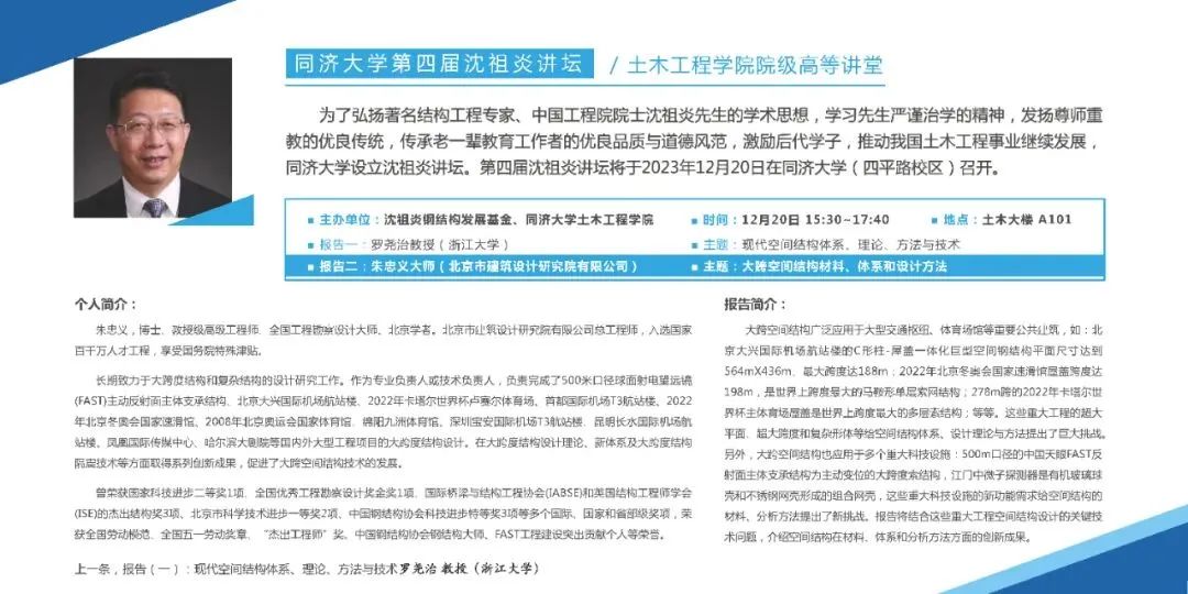 为了弘扬著名结构工程专家、中国工程院院士沈祖炎先生的学术思想,学习先生严谨治学的精神,发扬尊师重教的优良传统,传承老一辈教育工作者的优良品质与道德风范,激励后代学子,推动我国土木工程事业继续发展,bevictor伟德官网设立沈祖炎讲坛。第四届沈祖炎讲坛将于2023年12月20日在bevictor伟德官网(四平路校区)召开。