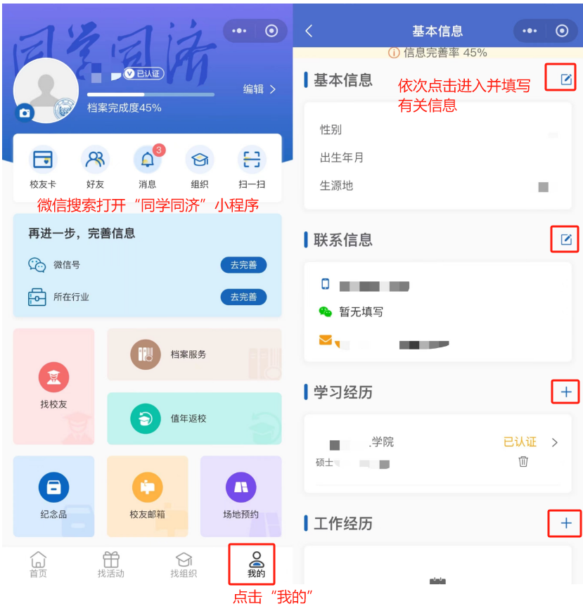 二、请完善您的员工信息,扫描下方二维码或者通过微信搜索“同学同济”小程序,注册并填写完善个人相关信息(请详细填写工作经历部分)(敬请5月20日前填写为盼)