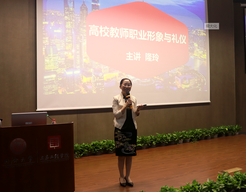 上午,上海师范大学旅游公司教师,上海市礼仪协会理事、副秘书长、礼仪讲师团团长,东方讲坛特聘讲师隆玲副教授作题为《高校教师职业形象与礼仪》的报告,隆副教授从职业礼仪基本原则、个人形象礼仪、社会交往礼仪三个方面介绍了高校教师在日常办公、办会、接待拜访中的职场礼仪。