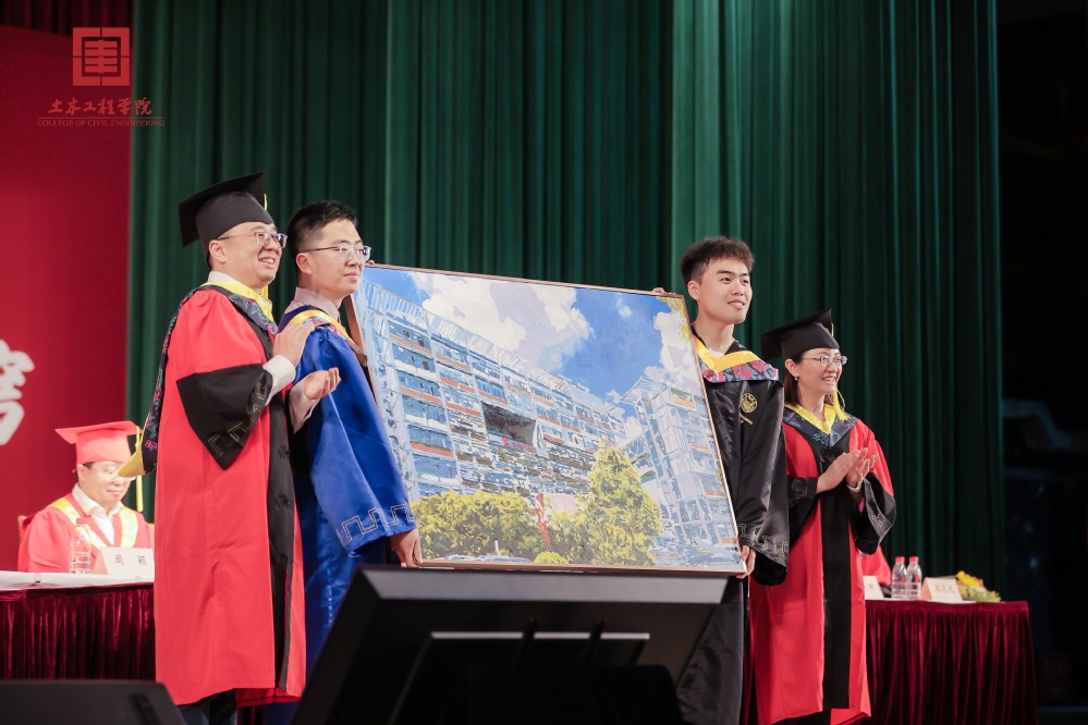 毕业礼物是一张由各个班级、各个系的2024届毕业生们共同绘制而成的土木大楼油画,每一笔都寄托着同学们的深切祝福和期许。