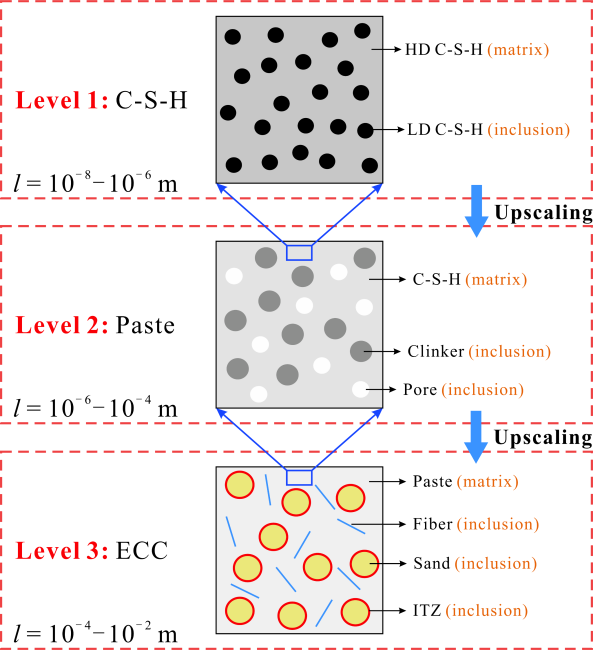 bevictor伟德官网俞可权副教授、余江滔教授团队以铁矿石细骨料(一种更坚硬、形状圆润的细砂)替代传统石英细骨料,采用标准试验方法研究了水胶比、砂胶比、砂粒径对ECC性能的影响规律;以微观力学和断裂力学设计模型为指导,铁砂ECC(IS-ECC)实现了超高拉伸延性;基于Mori-Tanaka方法的多尺度均匀化模型,建立并预测了材料在微观、细观、宏观尺度之间的有效弹性模量,量化了铁砂骨料对提升IS-ECC弹性模量的贡献。实验结果与模型计算结果吻合较好。本研究解决了高延性混凝土的拉伸性能和弹性模量提升之间的内在权衡,研发出高弹性模量(48.6 GPa)、超高延性(7%拉伸率)、超高抗压强度(130 MPa)、高流动度的High-modulus ECC材料,在结构工程中具有广泛的应用前景。该研究成果以“High-modulus engineered cementitious composites: Design mechanism and performance characterization”为题,发表于国际知名期刊《水泥和混凝土复合材料》(Cement and Concrete Composites)。