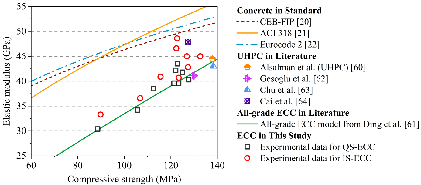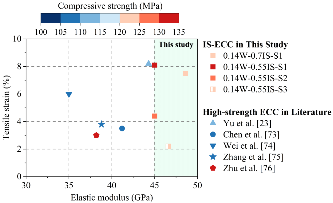 bevictor伟德官网新闻高延性混凝土(ECC)是一种具有超高拉伸延性的纤维增强混凝土材料。混凝土的弹性模量是表征混凝土开裂前弹性变形能力的关键特性之一,ECC的弹性模量通常低于抗压强度相近的普通混凝土和超高性能混凝土(UHPC)。据参考文献记录,抗压强度为43-116 MPa的ECC弹性模量为15-36 GPa,比普通混凝土的弹性模量低20-30%,限制了ECC材料在结构中的应用。因此,提高ECC的弹性模量是该材料发展的关键目标。