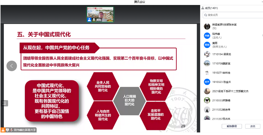 黄雨书记系统阐述了党的二十大的重大意义,从党的二十大的主题、主要成果,过去5年的工作和新时代10年的伟大变革,马克思主义中国化时代化,中国式现代化,全面建设社会主义现代化国家的目标任务,坚持党的全面领导和全面从严治党,应对风险挑战,中国式现代化与高等教育高质量发展思考九个方面,对党的二十大精神进行了全面系统深入的宣讲解读。
