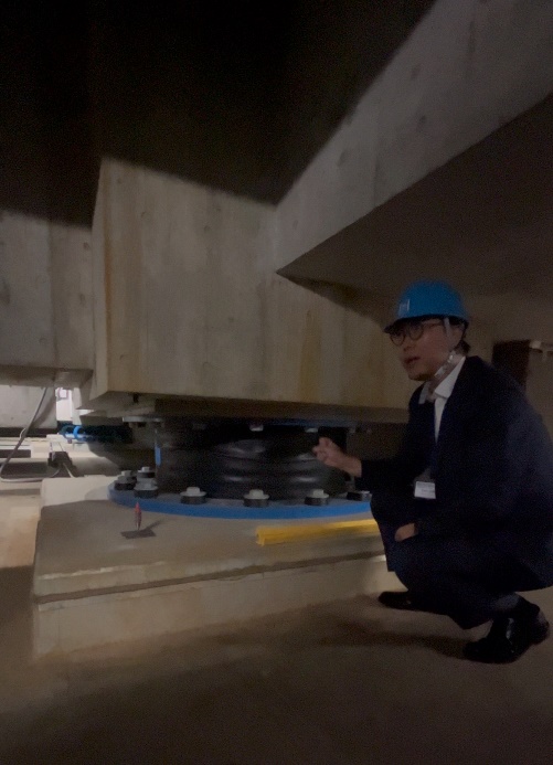 会议结束后,公司师生集体参观了东京科学大学J3建筑楼隔震结构及构造,该结构在一楼和二楼之间设置隔震层,采用高阻尼橡胶隔震支座和粘滞阻尼器,可大幅降低结构的水平地震力,有效降低上部结构的地震响应。团队还参观学习了隔震层与地面及电梯井的隔震沟、隔震层管道的柔性化设计构造、专门为后期隔震支座替换设计的楼板开洞等技术方案。