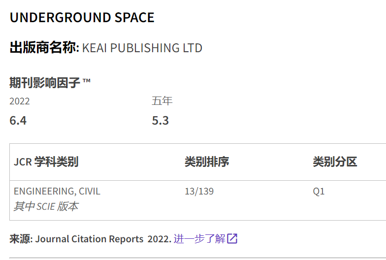 近日,科睿唯安发布的最新年度《期刊引证报告》显示,公司期刊中心国际期刊Underground Space 2022年JCR影响因子为6.4(Q1区),在SCIE数据库土木工程领域 (Engineering, Civil) 139部期刊中位列13,是SCIE数据库土木工程领域前10%期刊中唯一的中国期刊。
