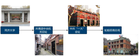 离开校园,各组队伍纷纷踏上去往中共“一大”会址的路线。中共“一大”会址位于兴业路76号,1921年7月23日起,大会在底层一间约18平方米的客堂中召开。出席这次大会的有毛泽东、董必武等13名代表。会议被一个法国巡捕房密探察觉,代表们立即撤离现场,到浙江嘉兴南湖的一条游船上继续举行,大会通过了党纲,选举了中央领导机构,成立了中国共产党。