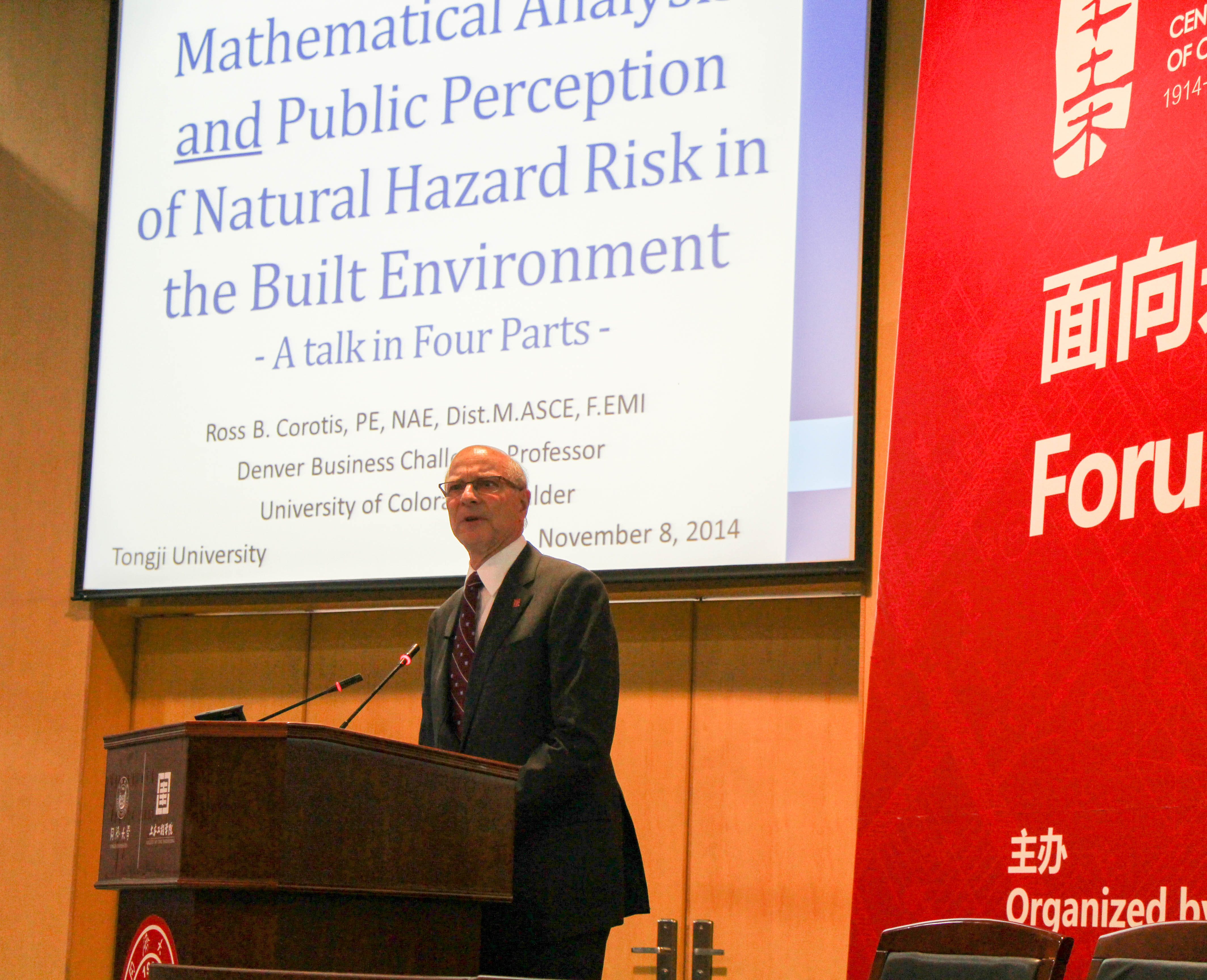 美国工程院院士Ross.B.Corotis作了题目为“建筑环境中自然灾害的数学分析与公众感受(Mathematical Analysis and Public Perception of Natural Hazard Risk in the Built Environment)”的报告。在报告中,Corotis教授对现代结构工程面对自然灾害风险的挑战和机遇进行了精彩的阐述。