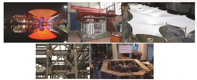 建筑结构、抗震研究、空间规划,组图依次为国家馆结构抗震性能研究、世博轴膜结构模型试验、主题馆消能减震技术应用、阳光谷节点试验