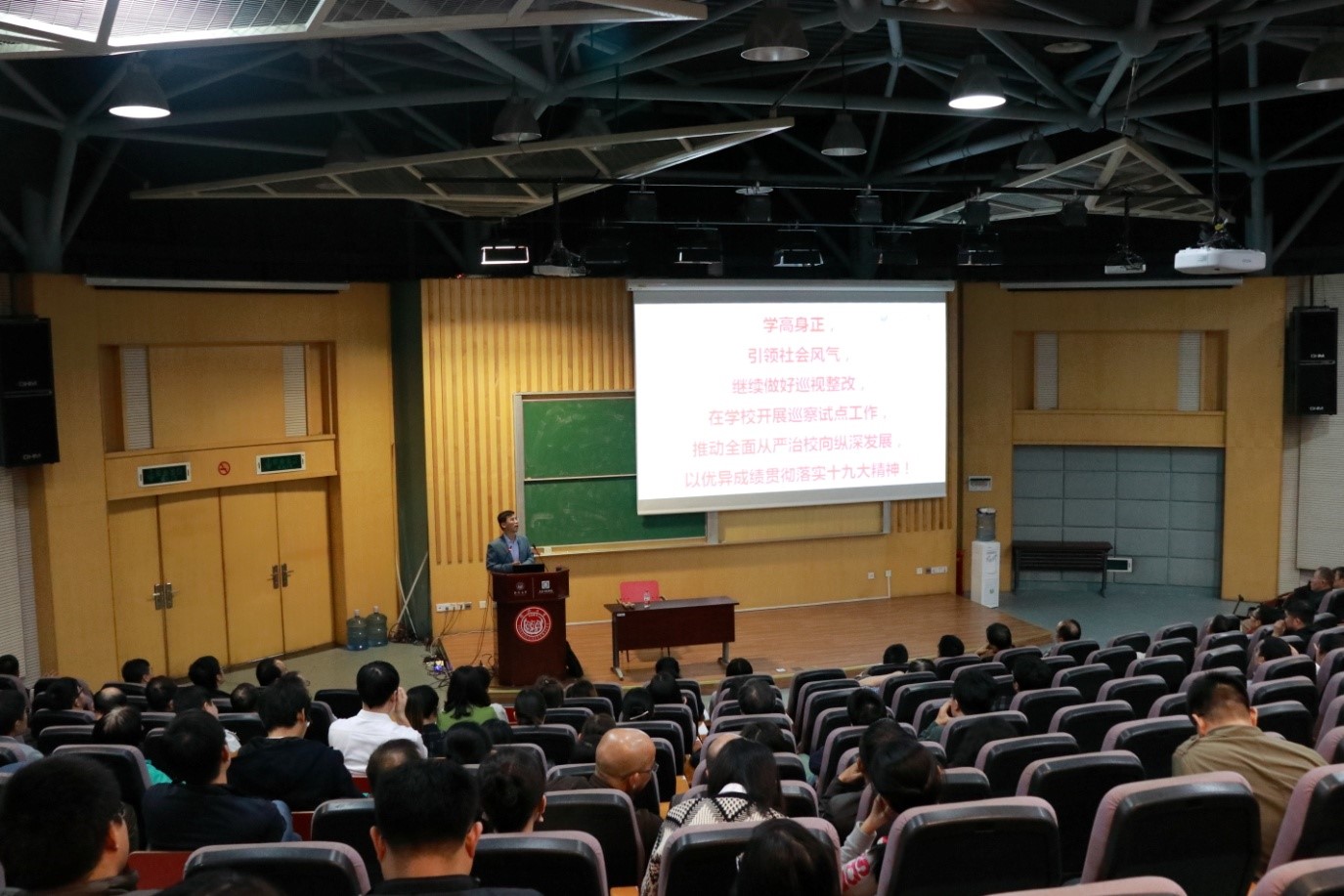 吴利瑞老师结合刚刚收看的习近平总书记十九大工作报告,从中央的第十二轮巡视整改情况中反映的高校问题谈起,具体列举了几个高校违反中央八项规定精神的典型案例,对在座的教师和职工有非常直接的教育性和警示性作用。结合习总书记在十九大报告中提到的“打虎、拍蝇、猎狐”,吴利瑞老师再次向教职工们宣传了中央有腐必反,有贪必肃的精神,讲解了高校以党章为遵循,以责任为导向的党内监督体系,并提出了高校从严管理,推进公司治理体系和治理能力现代化的思考。
