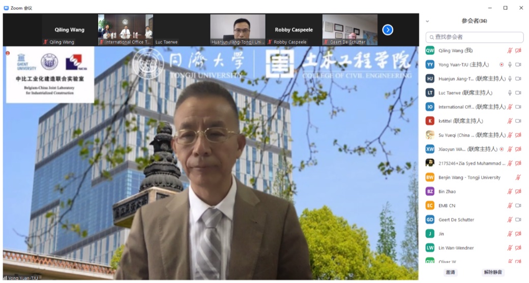 The Sino-Belgian International Symposium on Sustainable Constructions was held online  on September 13th and 14th, 2021. The event was initiated by Prof. Yong Yuan and Prof. Luc Taerwe from the College of Civil Engineering of Tongji University. It was jointly organized by the College of Civil Engineering of Tongji University, the Department of Structural Engineering and Building Materials of Ghent University, the Belgium-China Joint Laboratory for Industrialized Construction, and the China Platform of Ghent University. Representatives from the College of Civil Engineering include Prof. Huanjun Jiang, Vice Dean of the College, Prof. Yong Yuan, Prof. Bin Zhao, Prof. Suwen Chen, Prof. Jianzhuang Xiao, Prof. Zengfeng Zhao, and Dr. Jiaolong Zhang.