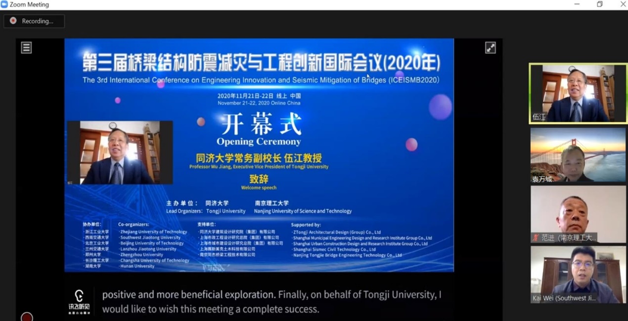 The 3rd International conference on Engineering Innovation and Seismic Mitigation of Bridges (ICEISMB 2020), sponsored by Tongji University and Nanjing University of Science and Technology, was held successfully online on November 21-22th, 2020. The conference went online this year due to the outbreak of COVID-19, in keeping with the spirit of connecting people to assist efficient, convenient and diversified global communication.  As an annually-held conference, ICEISMB has achieved its success in the past 2 years. In 2020, ICEISMB attracted more than 900 attendees coming from 28 universities from overseas, more than 90 universities and 50 enterprises and institutions in mainland China.