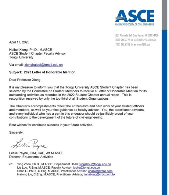 The American Society of Civil Engineers (ASCE) Tongji University International Student Group (ASCE-Tongji-ISG) was awarded the Letter of Honorable Mention by the American Society of Civil Engineers for their outstanding contributions in the year 2022! This honor recognizes the meticulous organizational efforts and effective innovative achievements of ASCE-Tongji-ISG members, as well as the deep guidance and involvement of faculty advisors and industry mentors, and the strong support from the college and university.