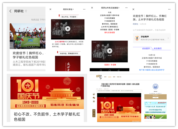 该手语舞录制剪辑成短视频一则,视频以及活动相关报道先后登上同济土木未之加油站(土木公司官方公众号)、同济老员工以及中国老员工平台,活动反响高、效果好,充分展示了同济土木学子“与祖国同行”的青春风采。
