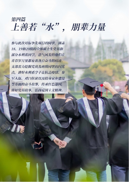 水利工程系硕士生党支部覆盖水利工程系全体60余名硕士研究生,员工分布在2018级、2019级、2020级等多个年级,意气风发的他们在青春岁月里都有着各自奋斗的痕迹。支部着力挖掘成员的闪光点,讲好水利系学子在参军入伍、对口扶贫等方面的奋斗故事,传承红色基因,讲好党员故事,弘扬爱国主义精神。