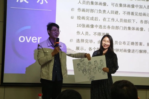 为了展示各部门风采,加强不同部门间的了解,大会还进行了部门展示和素拓游戏两个环节。部门展示环节,各部门成员手绘部分集体画像,展示部门风采。三大素拓游戏:听个过“影”发现中华小影库;谁最贪“杯”花样比拼速度;情“投”意合考验默契与配合。在一片欢声笑语中,新成员大会也接近了尾声。