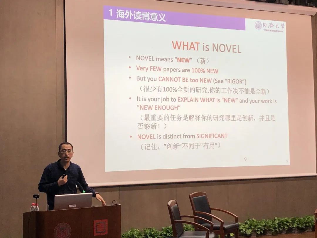 郑虎老师之后,张东明老师作《研究生的学术发展与就业选择》分享。张东明老师首先阐明了海外读博必须注意的几个关键词:RIGOR(严谨)、NOVEL(创新)、SIGNIFICANT(有用)、IMPACTFUL(影响力),随后详细解释了这四个名词。