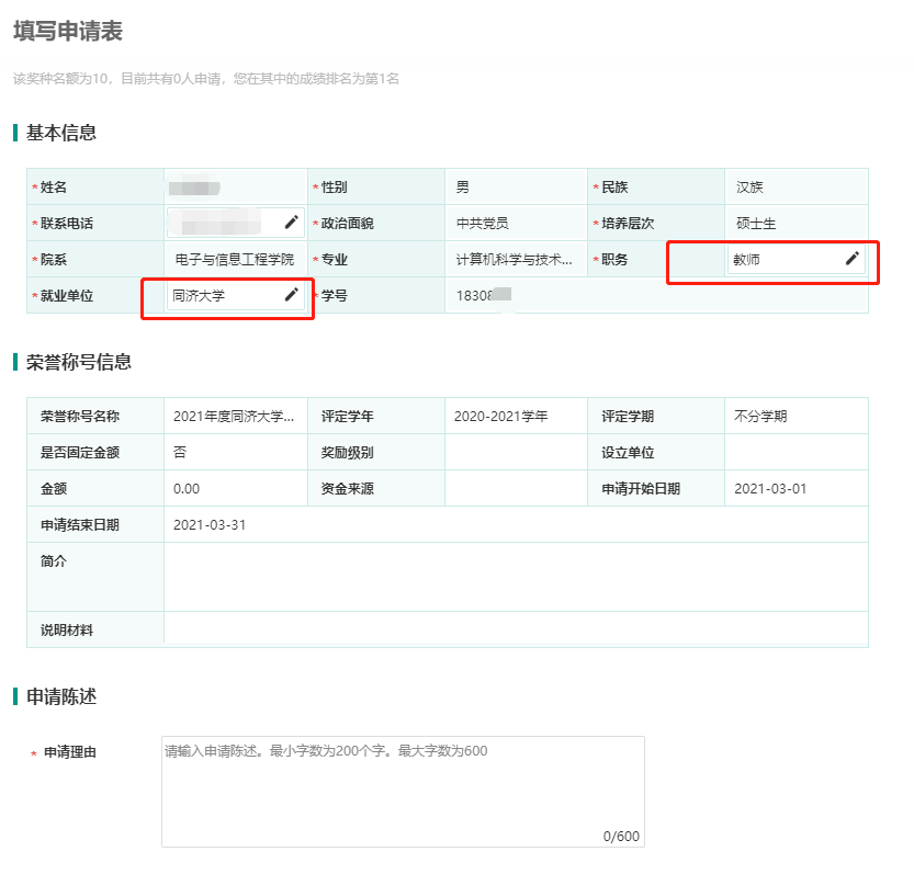 注:申请陈述中申请理由部分以第一人称填写本人事迹材料,曾获荣誉自大学阶段填起