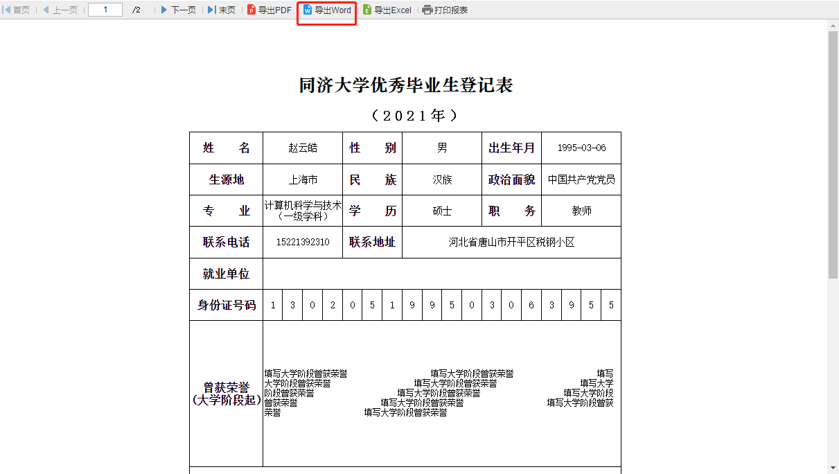 3.点击打印打印申请表。生成符合上海市要求的优秀毕业生登记表格。