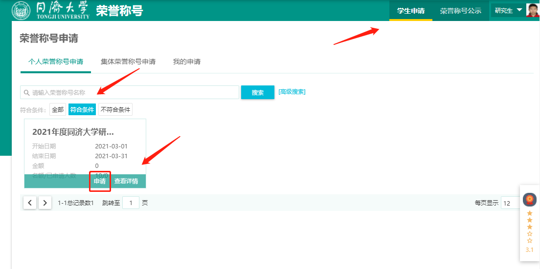 1.员工登录myportal.tongji.edu.cn,进入学工栏目下的荣誉称号模块。