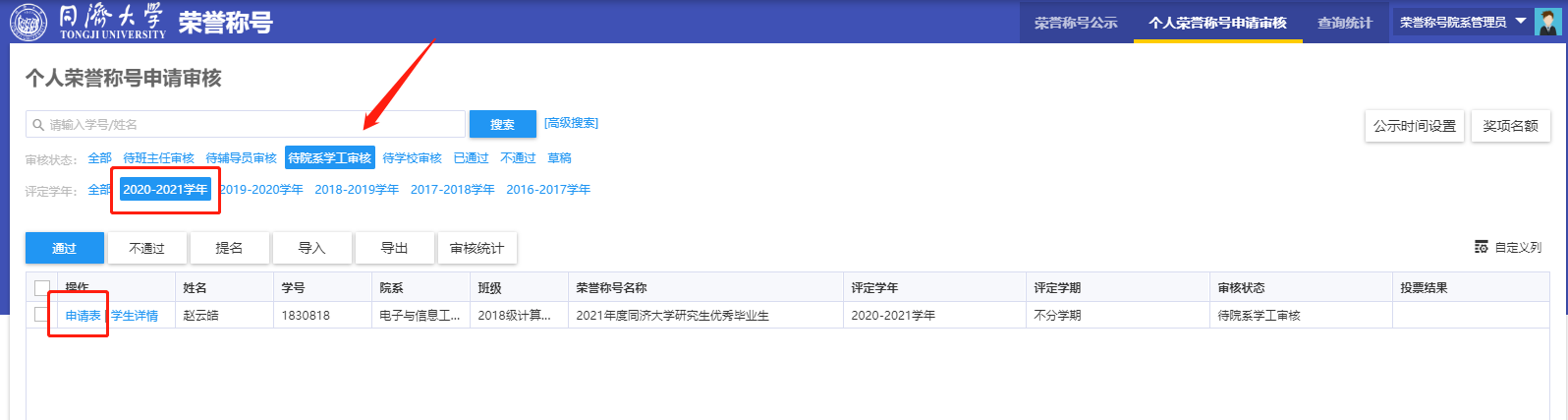 公司管理员进入荣誉称号模块,查看2020-2021学年待院系学工审核的申请数据,点击申请表查看员工申请情况。