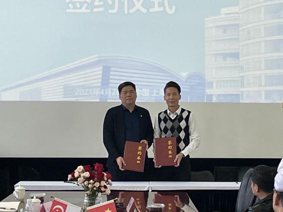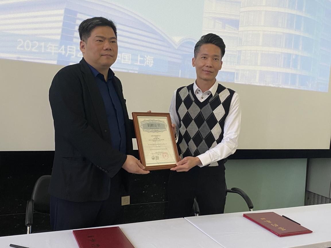 签约仪式上,公司党委副书记严长征同上海美特幕墙有限公司董事长余子洋签署捐赠协议,并颁发捐赠证书,回赠捐赠纪念立方体。