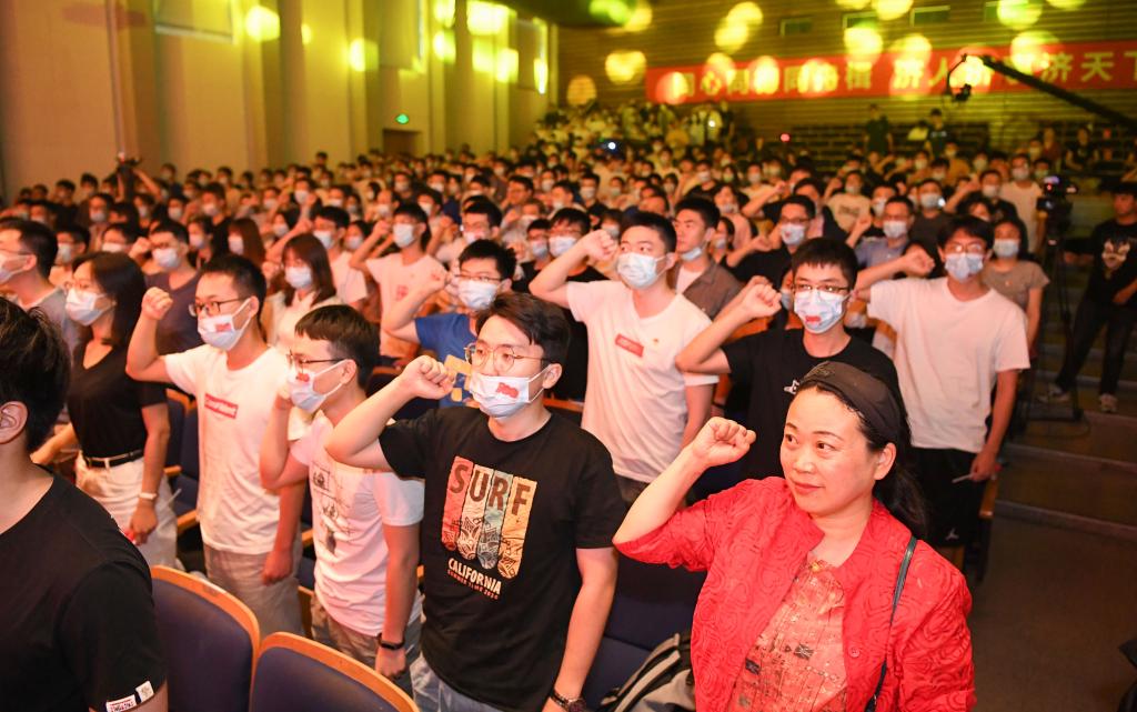演出最后,在2020年“全国优秀共青团员”、2019年上海市青年五四奖章获得者、公司2018级博士研究生张文津带领下,全场师生党员起立,面对鲜艳的党旗,庄重地举起右手,共同重温了入党誓词。铿锵有力的誓言,响彻礼堂。