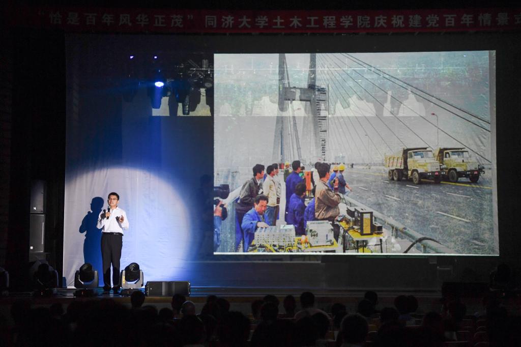 桥梁工程系教师操金鑫在第六篇章“大国工程”中担任讲述者。他说:“同济桥梁人在中国大桥自主建设中展现出的共产党员的赤子之心、舍我其谁的宏大气魄,犹如声声号角,必将激励一代代同济人传承报国情怀,孜孜以求工作,在新百年征程中推动桥梁强国建设不断实现新的跨越。”