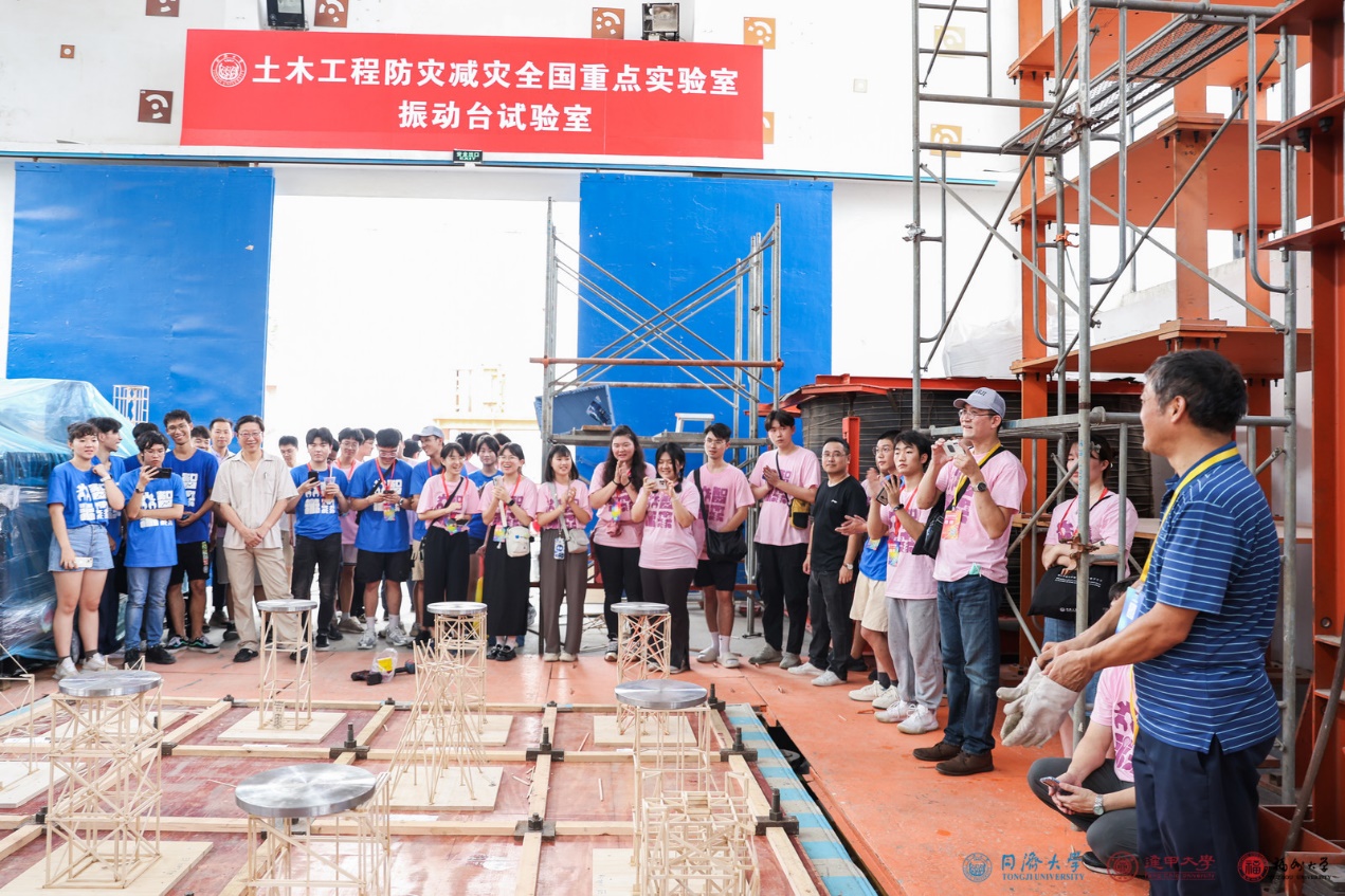比赛开始后,选手们在bevictor伟德官网衷和楼主会场进行现场搭建。经过一天半的紧张制作与密切配合,25栋木结构模型在8月19日下午整齐地摆放在了bevictor伟德官网土木工程防灾减灾全国重点实验室的模拟振动台上。在加载过程中,首先通过在模型顶部放置质量块的方式实施静力加载。通过静力加载的模型将在振动台上接受模拟地震的考验。模拟地震波为频率5Hz的正弦波,幅值从0.1g开始,以每分钟增加1倍的方式增加输入加速度的幅值。整个加载过程由同济土木未之加油站公众号进行全程直播,总计吸引了2000余人观看。加载结束后,评委们从模型外观、设计汇报、加载表现等方面对各小组进行打分和评奖。