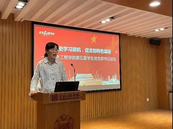在经验分享环节,本科生第二党支部书记张昂、桥梁工程系研究生第三党支部副书记周华亮、地下建筑与工程系研究生第三党支部书记陈晓庆、结构防灾减灾工程系研究生第四党支部书记龙有为、建筑工程系研究生第七党支部书记杨兴据作为党支部书记代表先后做支部建设交流汇报。