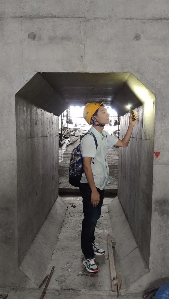 今年暑假,周昊来到中交第二航务工程局有限公司的建设现场,发现工地并非想象中尘土飞扬,课本上的先进技术,这里应用得如虎添翼。“出于安全考虑,我们主要负责监控混凝土车下料,记录每车方量,同时也观察学习,有问题随时请教老师,”已经晒得黑乎乎的他,虽然辛苦,却挺兴奋。浇筑、灌浆、振捣……停在书上的专有名词,在眼前活生生展现,更多现实的、复杂的问题如何解决,老员工们用眼睛看,用笔记,要学的太多了。当然,跟工人师傅们同吃同住,他们对伙食也印象深刻——炒豆皮、鱼香肉丝……干得辛苦,每顿饭菜都吃得特别香。