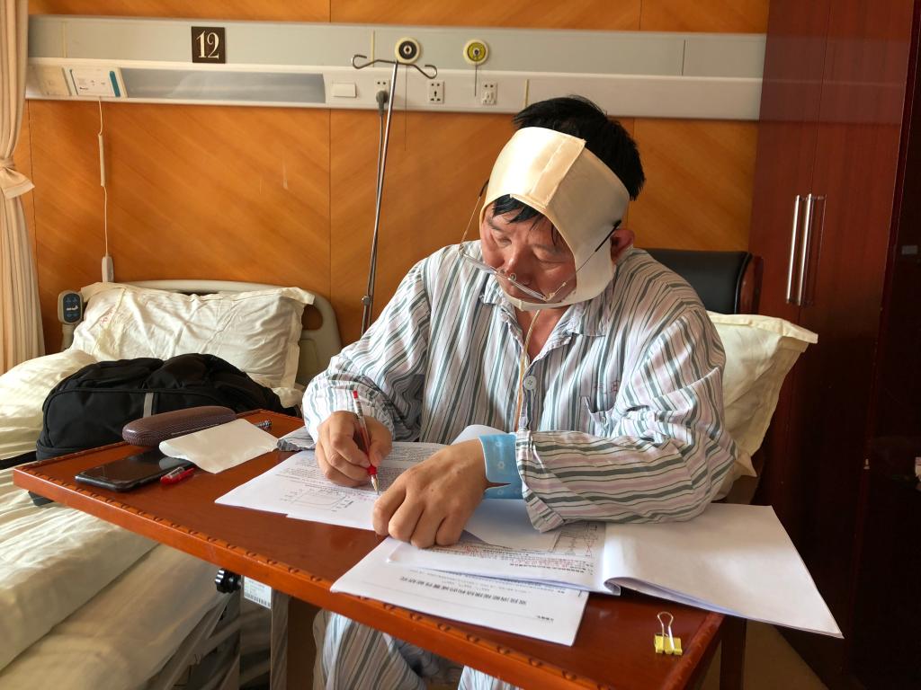 几位老师不约而同提及令他们至今仍感佩不已的3年前的一幕。那是2018年8月,李国强教授在医院接受一个头颈部手术。手术第二天,头部扎着纱布的李老师就坐在病床边,一边打着吊针,一边拿着红笔给员工修改论文。出院后的第二天,他的身影就出现在了研究室的讨论会上。有照片定格下那令人难忘的情景。